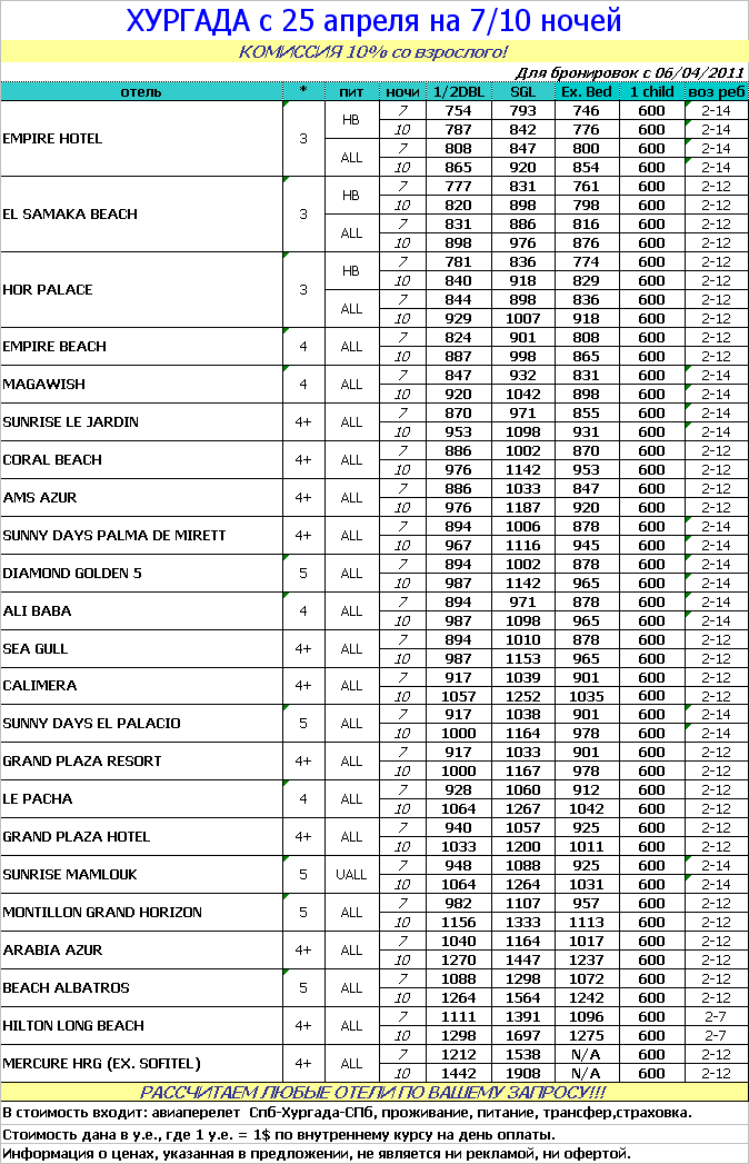 06 Апр 2011 12:18:29 ЕГИПЕТ. ХУРГАДА с 25 апреля на 7/10 ночей - от фирмы БАГИРА