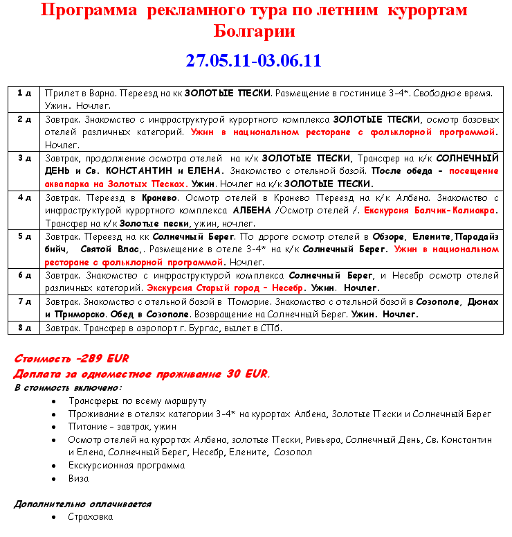 07 Апр 2011 14:42:29 БОЛГАРИЯ 27.05-03.06 - РЕКЛАМНЫЙ ТУР за 289 EUR от фирмы АЛМА ТУР