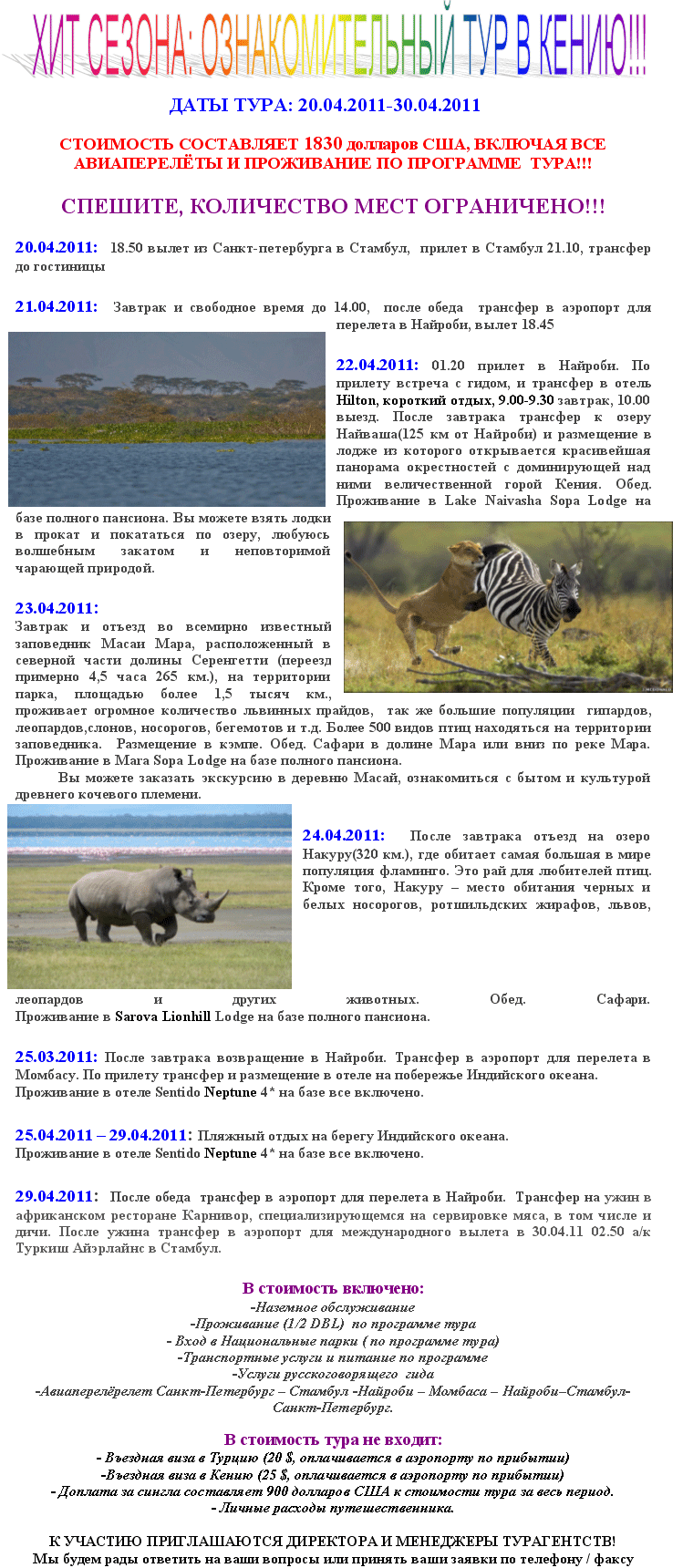 09 Апр 2011 15:00:16 КЕНИЯ 20.04-30.04 Рекламно-Ознакомительный Тур за $ 1830 от фирмы КОНСОРД