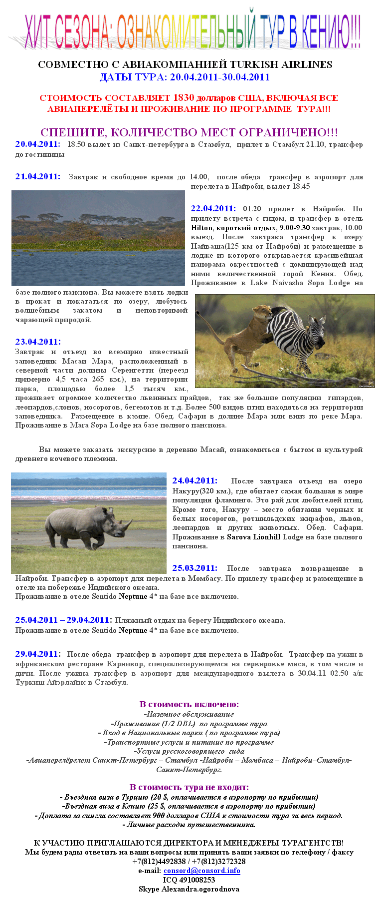 12 Апр 2011 12:06:04 КЕНИЯ: РЕКЛАМНО-ОЗНАКОМИТЕЛЬНЫЙ ТУР 20.04-30.04.11. ПОСЛЕДНИЕ 2 МЕСТА!!! СТОИМОСТЬ 1830 ДОЛЛАРОВ США!!! от фирмы КОНСОРД