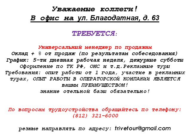 14 Апр 2011 15:07:30 ВАКАНСИЯ от фирмы TRIVE ТУР