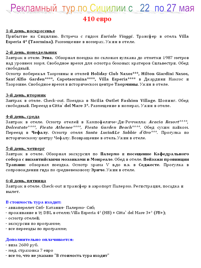 19 Апр 2011 11:55:34 РЕКЛАМНЫЙ ТУР ПО СИЦИЛИИ с 22 по 27 мая от фирмы АВАТАРА