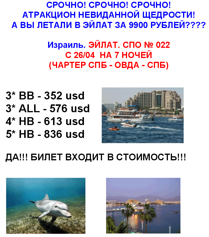 23 Апр 2011 10:05:44 ИЗРАИЛЬ - ЭЙЛАТ 26.04 на 7н за 9 900 руб ВКЛЮЧАЯ АВИА от фирмы СОЛВЕКС