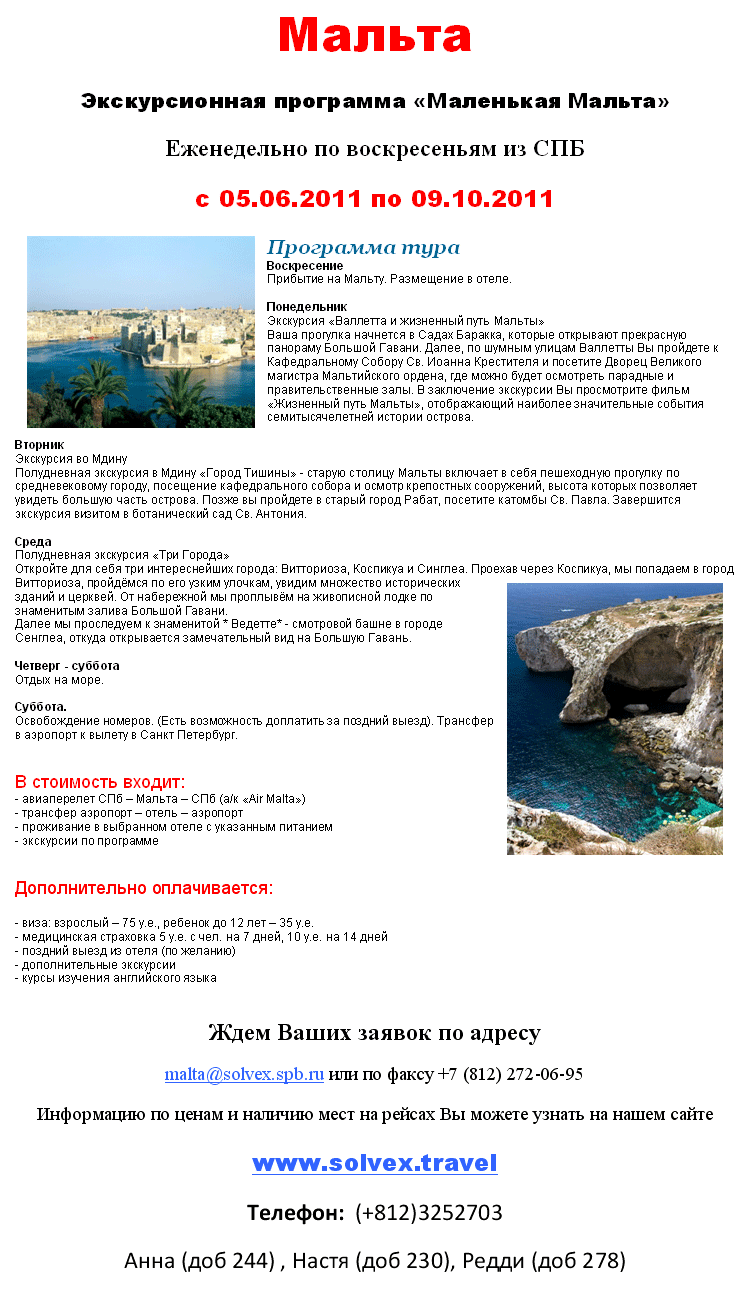 25 Апр 2011 17:30:07 МАЛЬТА. Экскурсионная программа "Маленькая Мальта" из СПб от фирмы СОЛВЕКС