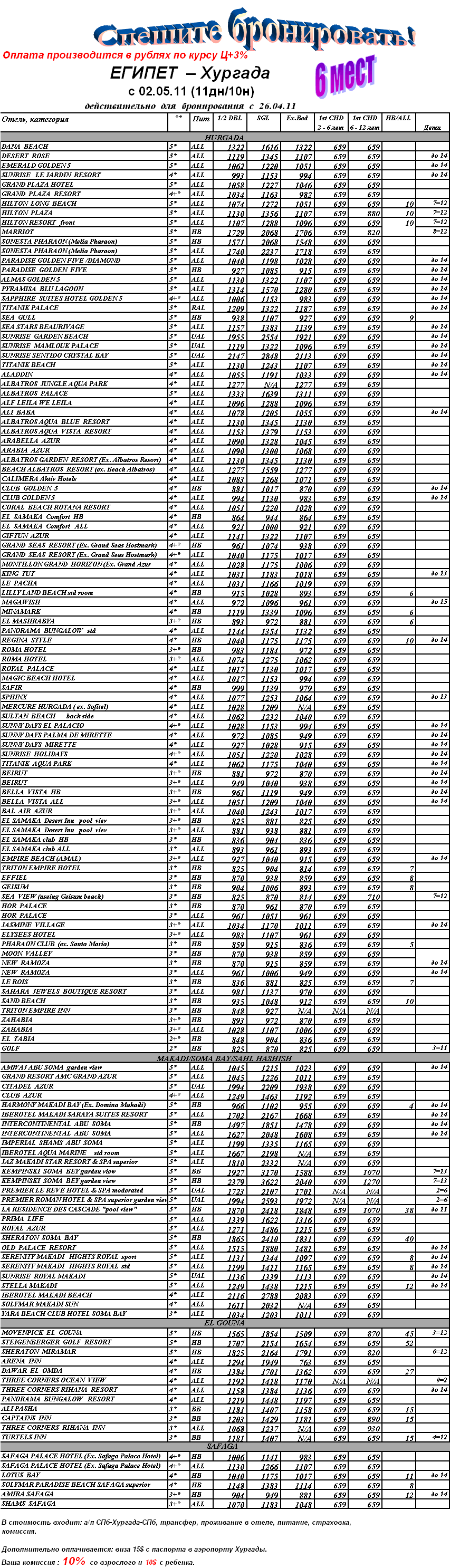 26 Апр 2011 12:57:24 ЕГИПЕТ - ХУРГАДА с 02.05 на 11дн/10н от фирмы ТУРНЕ