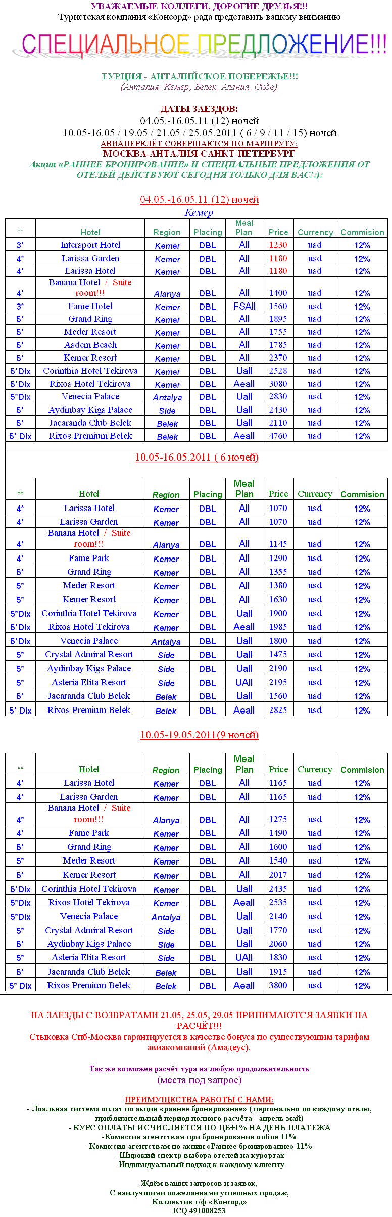 27 Апр 2011 14:09:47 ТУРЦИЯ АНТАЛИЯ ЗАЕЗДЫ С 04.05 И 10.05 МОСКВА-АНТАЛИЯ-СПБ: СПО от ОТЕЛЕЙ АНТАЛИЙСКОГО ПОБЕРЕЖЬЯ от фирмы КОНСОРД