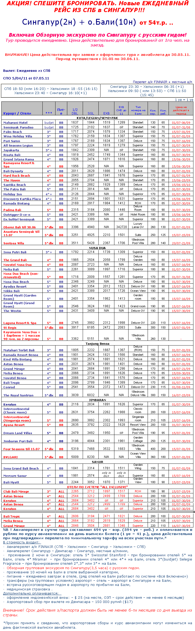 16 Май 2011 10:20:12 СИНГАПУР + о.БАЛИ из СПБ от 54 ТЫС.РУБ. ВКЛЮЧАЯ ПЕРЕЛЕТ и ОБЗОРНУЮ ЭКСКУРСИЮ. ВЫЛЕТ ЕЖЕДНЕВНО от фирмы ПИТЕРТУР