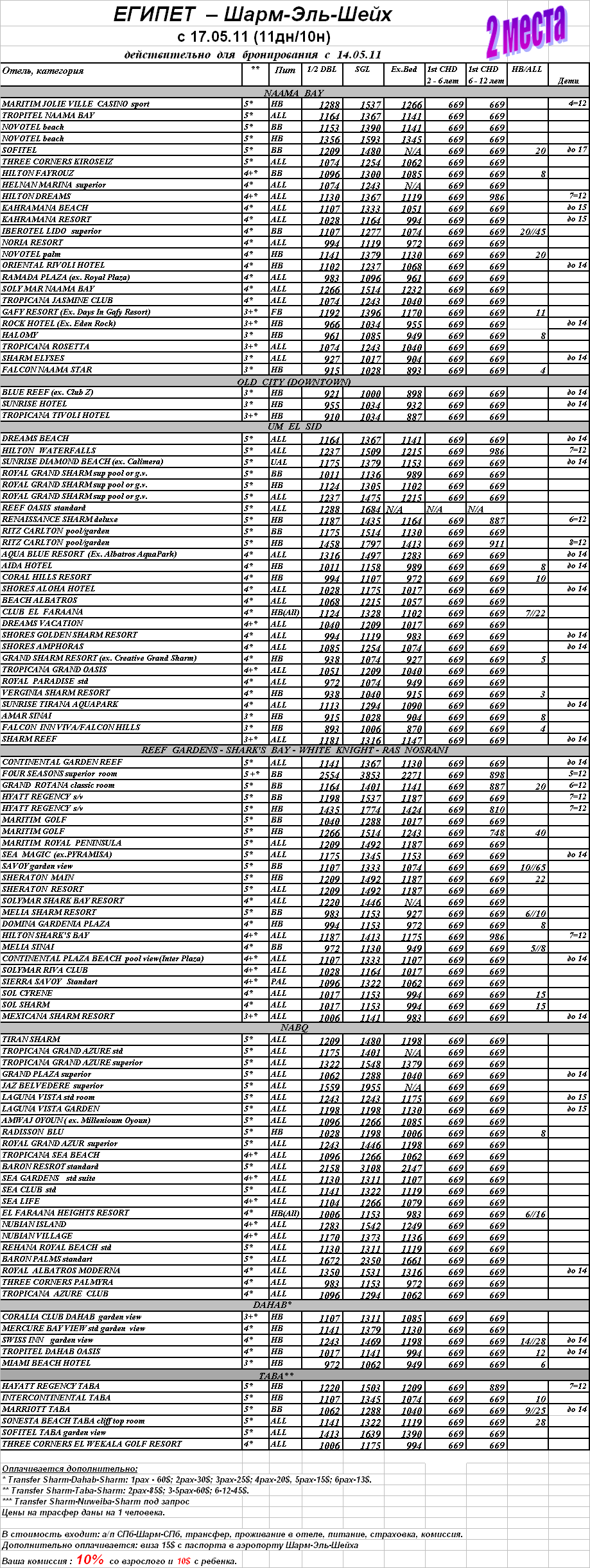14 Май 2011 13:39:24 ЕГИПЕТ - Шарм-Эль-Шейx. 2 последних места с 17.05.11 (11дн/10н) от фирмы ТУРНЕ
