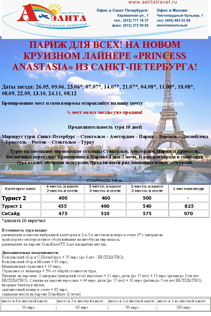 16 Май 2011 15:29:00 ФРАНЦИЯ. Париж для всех! на новом круизном лайнере "Принцесса Анастасия" 10 дней от фирмы АЭЛИТА