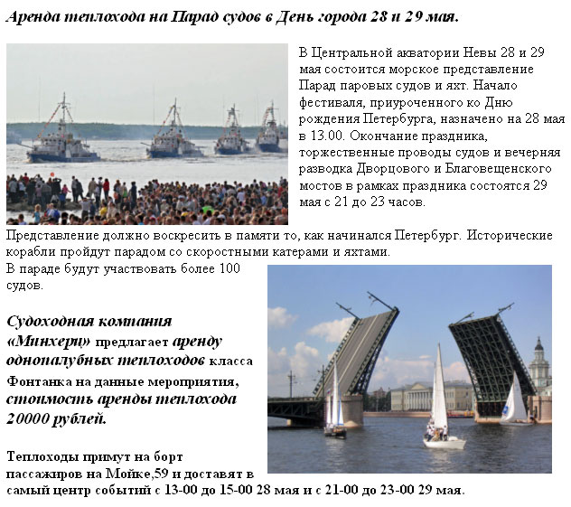 18 Май 2011 10:21:48 РОССИЯ - СПб - Аренда теплохода на Парад судов в День города 28 и 29 мая от фирмы МИНХЕРЦ