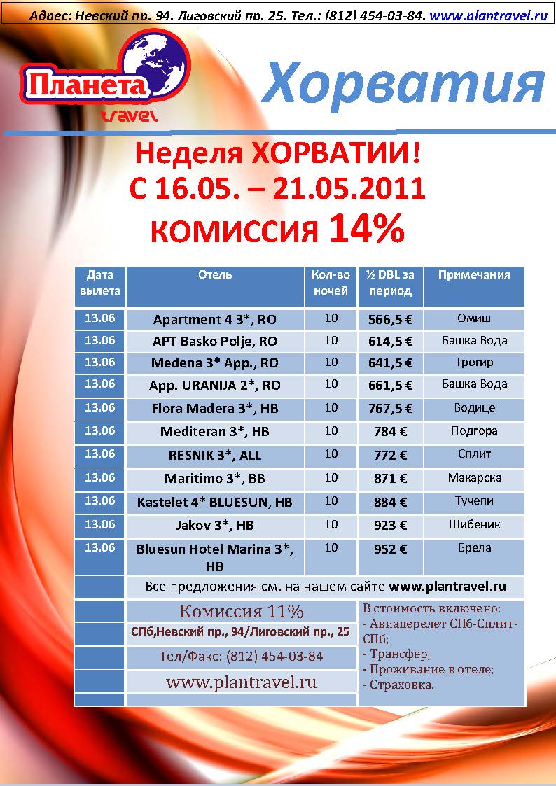 18 Май 2011 15:27:59 ХОРВАТИЯ, Сплит 13.06. от 566 евро! КОМИССИЯ 14% от фирмы ПЛАНЕТА TRAVEL