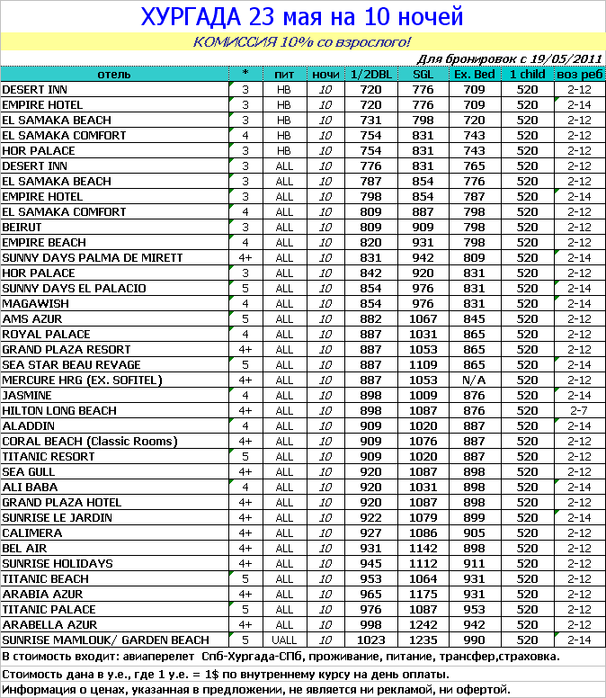 19 Май 2011 14:59:31 ЕГИПЕТ - ХУРГАДА 23 мая на 10 ночей от фирмы БАГИРА