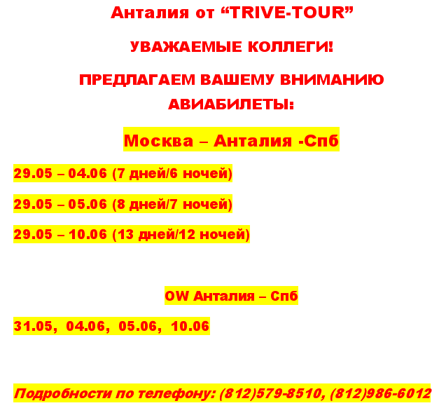 25 Май 2011 13:26:45 ТУРЦИЯ АВИА 29.05-04/0510.06 Москва-Анталия-СПб, OW Анталия-СПб 31.05, 04/05/10.06 от фирмы TRIVE ТУР