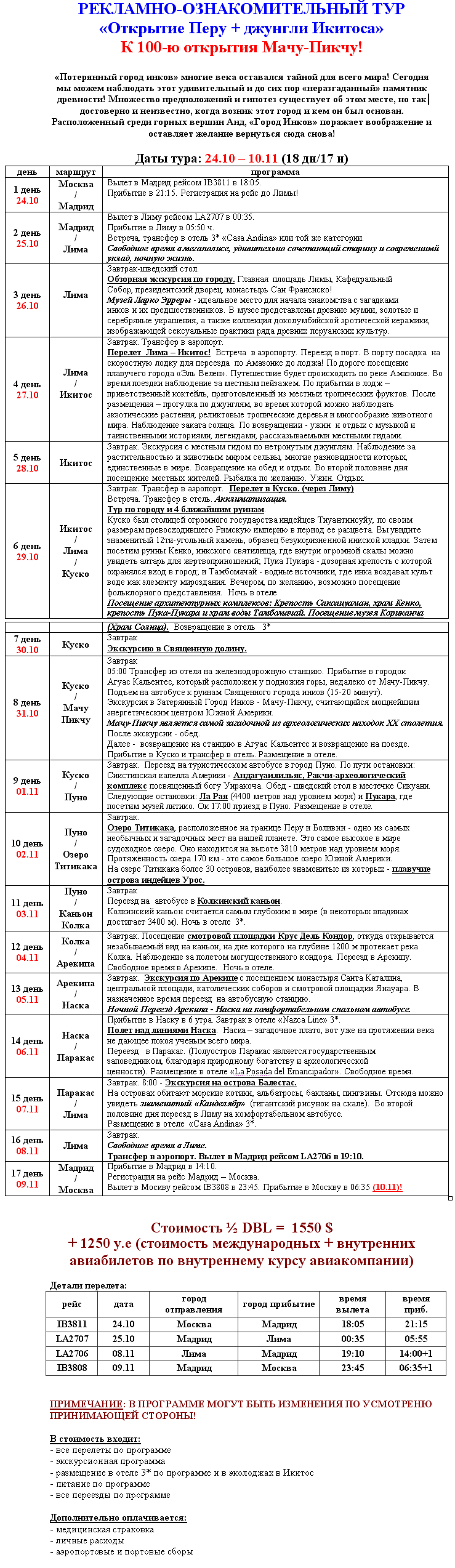 31 Май 2011 10:28:51 ПЕРУ 24.10-10.11 РЕКЛАМНЫЙ ТУР "Открытие Перу+джунгли Икитоса" от фирмы ПРОТРЕВЭЛ