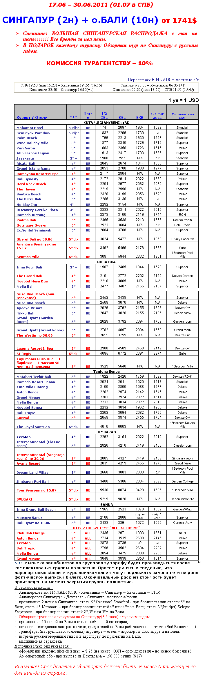 30 Май 2011 14:11:21 СИНГАПУР+О.БАЛИ 17.06-30.06 ОТ 1741 $. ГАРАНТИРОВАННЫЙ ТУР ИЗ СПБ. ОБЗОРКА ПО СИНГАПУРУ В ПОДАРОК от фирмы ПИТЕРТУР