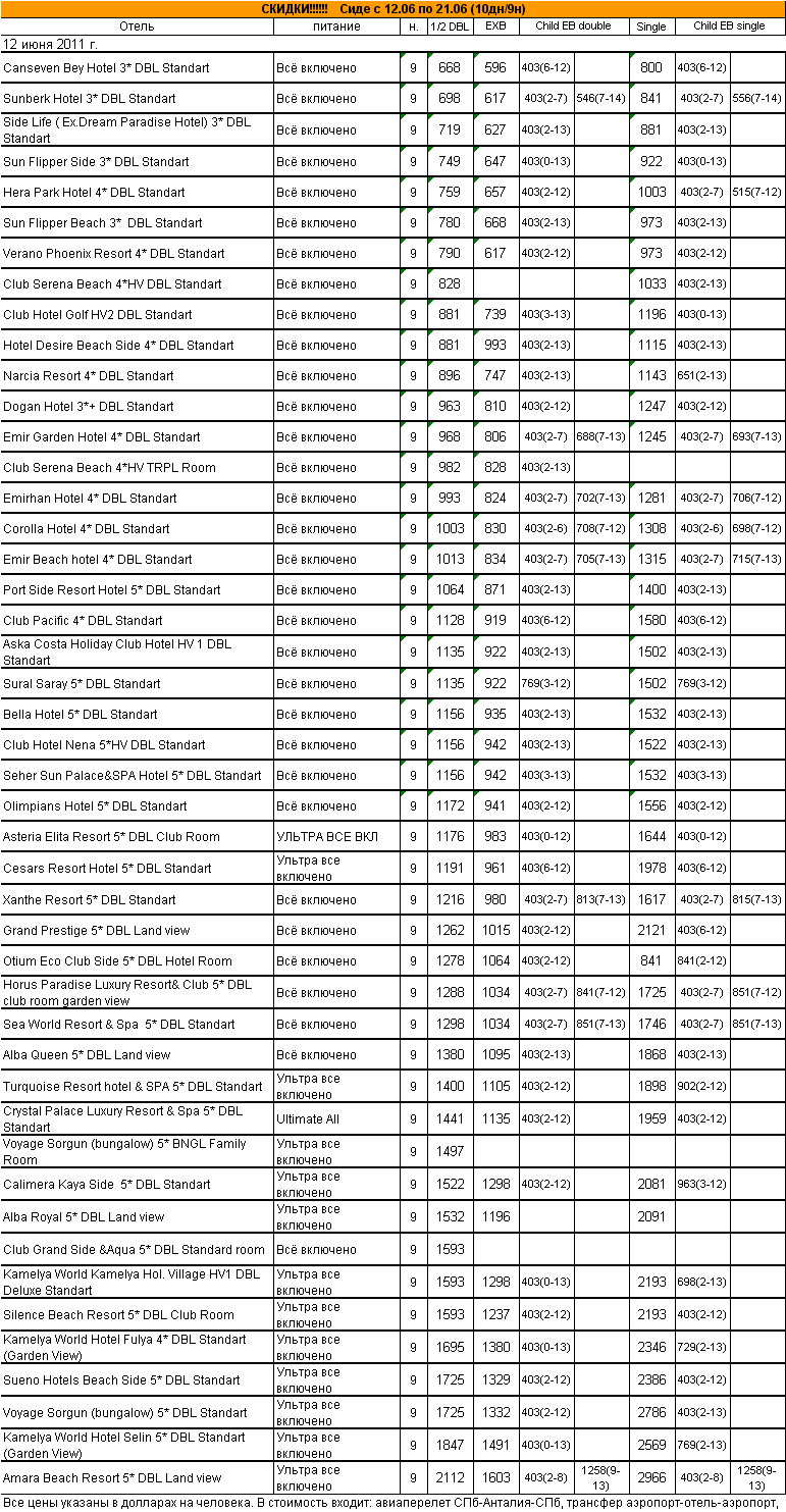 01 Июн 2011 11:55:59 ТУРЦИЯ - СИДЕ с 12.06 по 21.06 от фирмы АЛМА ТУР