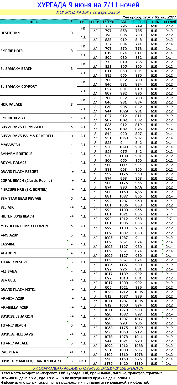 02 Июн 2011 11:40:37 ЕГИПЕТ- ХУРГАДА 09 июня на 7/11 ночей от фирмы БАГИРА
