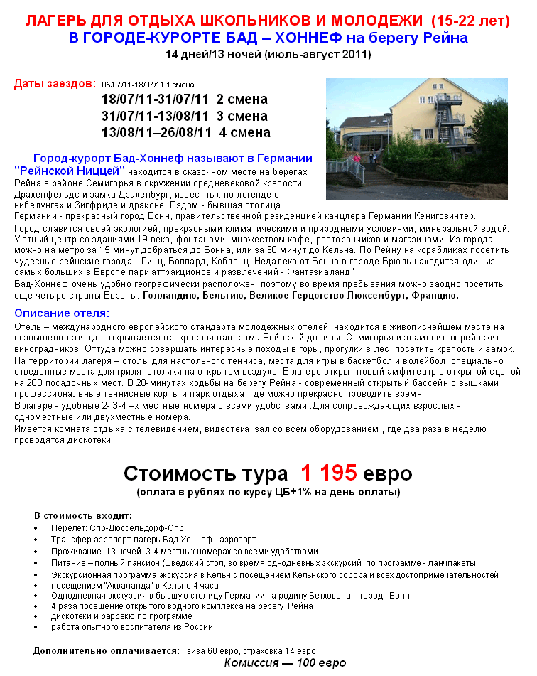 14 Июн 2011 12:07:05 ГЕРМАНИЯ: Молодежный центр от 15 до 22 лет от фирмы АЛМА ТУР