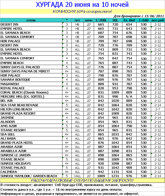 15 Июн 2011 12:21:25 ЕГИПЕТ. ХУРГАДА 20 июня на 10 ночей от фирмы БАГИРА