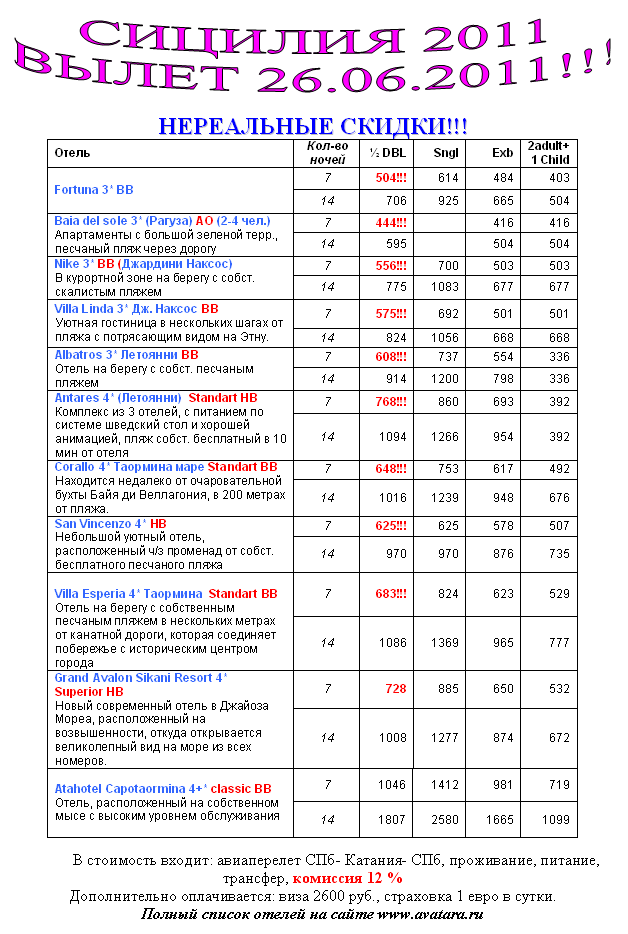 20 Июн 2011 18:00:18 ИТАЛИЯ - СИЦИЛИЯ с 26.06, рейс на Катанию, Нереальные Скидки от фирмы АВАТАРА