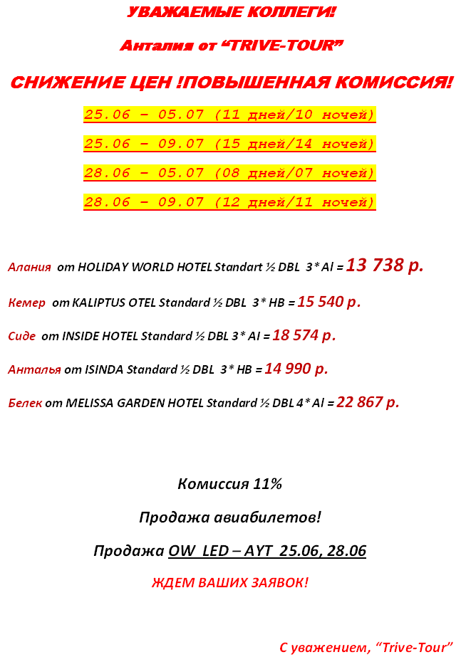 23 Июн 2011 14:30:11 ТУРЦИЯ Горящая Анталия - 25.06, 28.06 на 7, 11, 15 ночей от 13 738 рублей! от фирмы TRIVE ТУР