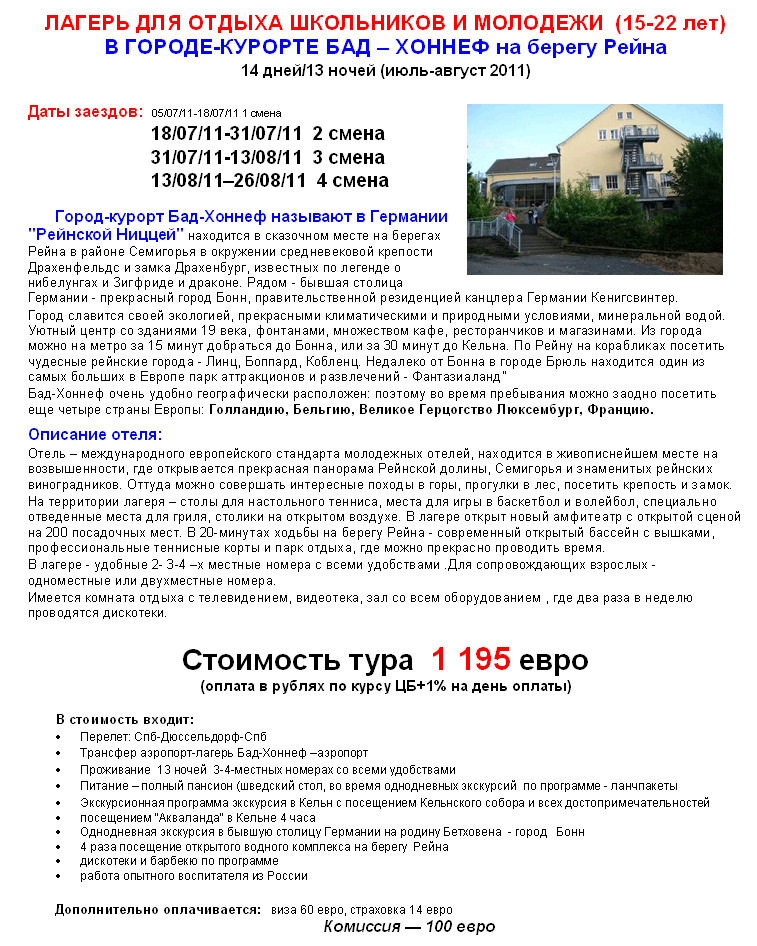 23 Июн 2011 14:42:48 ГЕРМАНИЯ: Молодежный центр от 15 до 22 лет от фирмы АЛМА ТУР