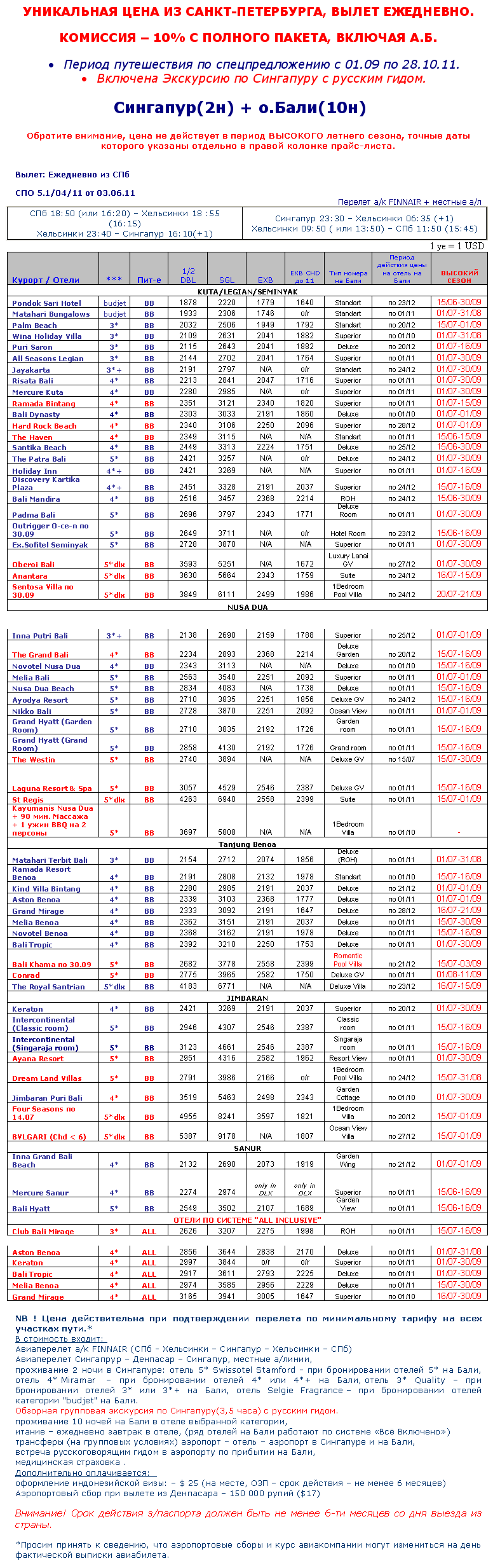 27 Июн 2011 10:08:03 СИНГАПУР + о.БАЛИ ИЗ СПБ от 1878$ распрордажа с 01.09-28.10.Комиссия-10% от фирмы ПИТЕРТУР