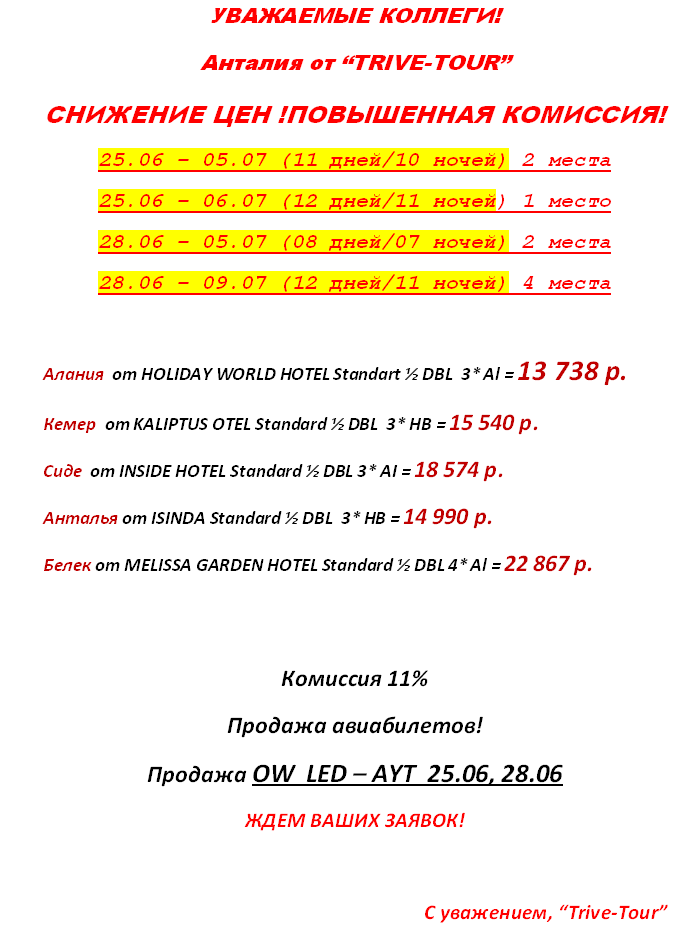 24 Июн 2011 13:21:37 ТУРЦИЯ. Анталия - Спепредложение 25.06, 28.06 на 7, 11, 15 ночей от фирмы TRIVE ТУР