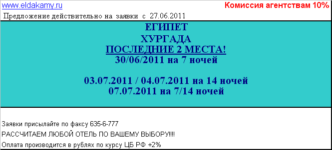 28 Июн 2011 13:39:05 ЕГИПЕТ - ХУРГАДА 30.06, 03.07, 04.07, 07.07 от фирмы EL DAKAMY TRAVEL