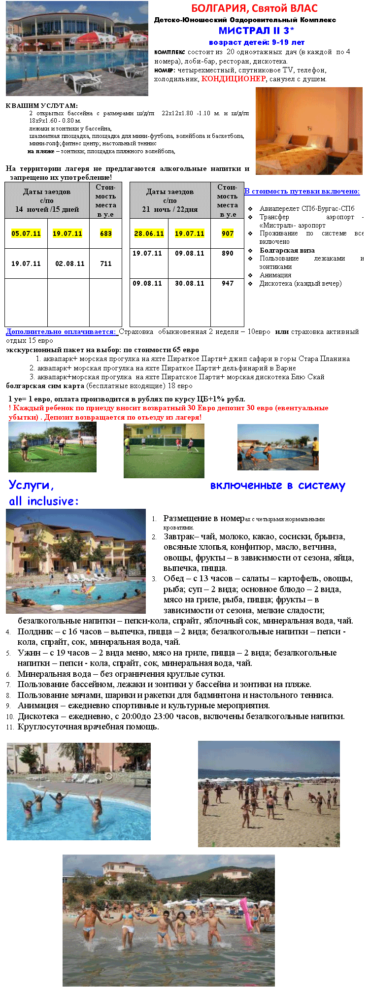 01 Июл 2011 15:21:39 БОЛГАРИЯ - Св. Влас - МИСТРАЛ II 3* - Детско-Юношеский Оздоровительный Комплекс от фирмы АЛМА ТУР