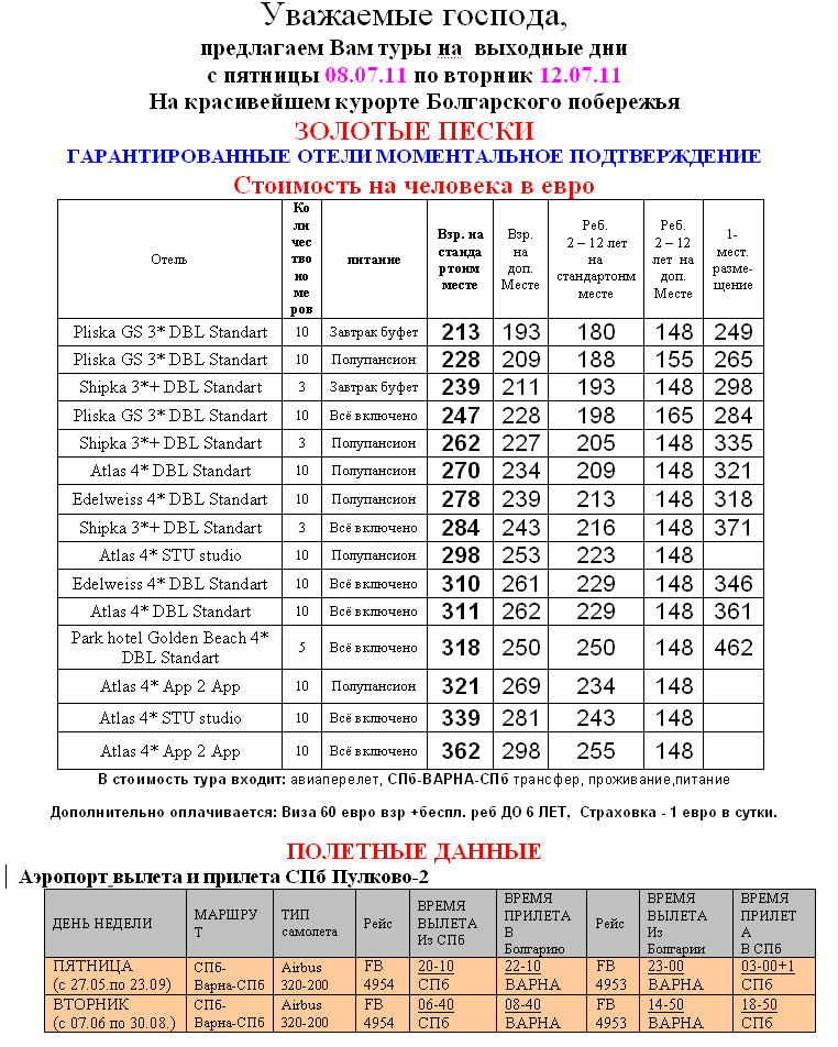 01 Июл 2011 18:01:22 БОЛГАРИЯ - ЗОЛОТЫЕ ПЕСКИ с 08.07 и 12.07 от фирмы АЛМА ТУР