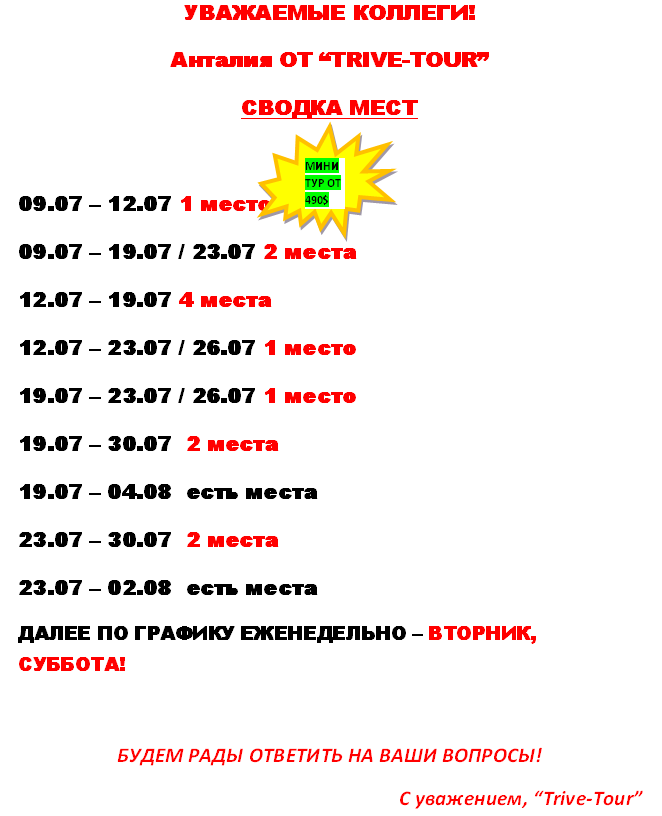 04 Июл 2011 14:05:53 ТУРЦИЯ - АНТАЛИЯ - СВОДКА МЕСТ! от фирмы TRIVE ТУР