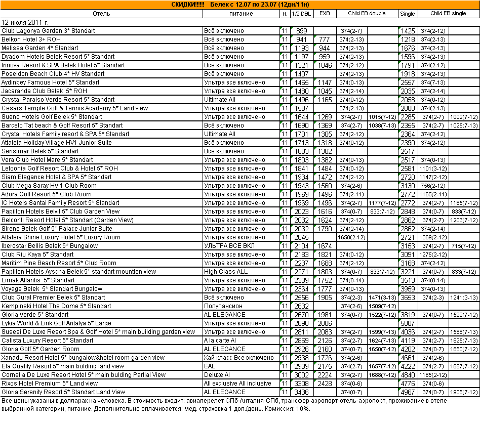 05 Июл 2011 14:24:24 ТУРЦИЯ. Белек с 12.07 по 23.07 (12дн/11н) от фирмы АЛМА ТУР