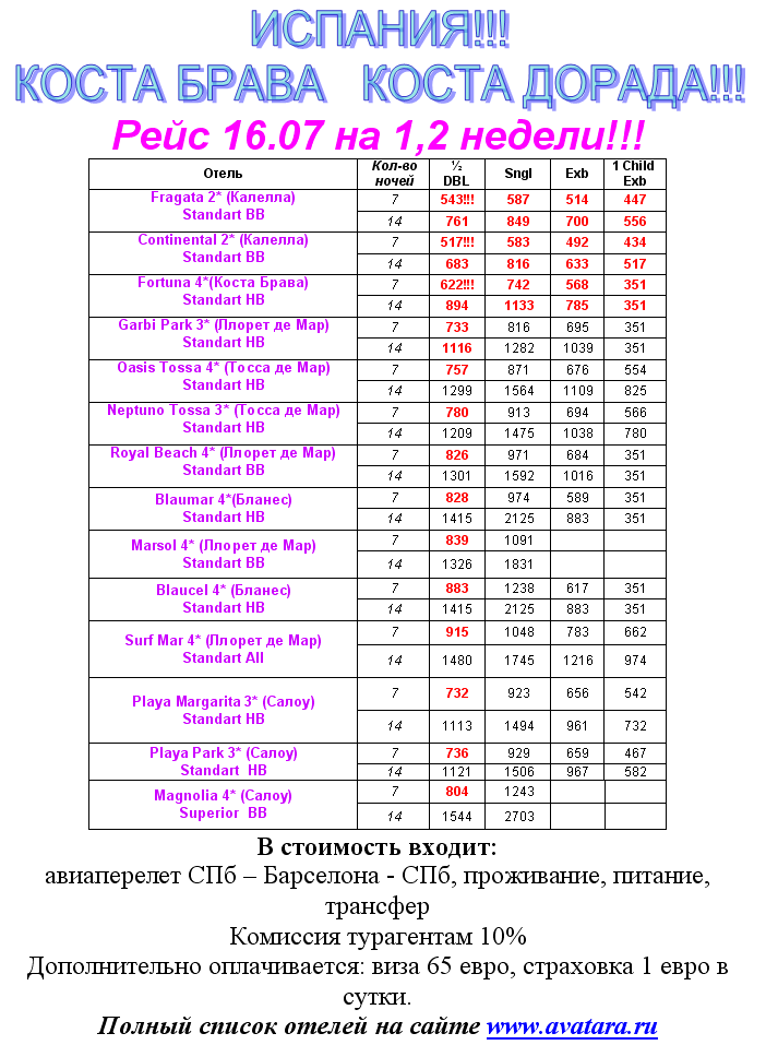 06 Июл 2011 12:02:28 ИСПАНИЯ 16.07 на 1/2 нед, ВЫГОДНЫЕ ПРЕДЛОЖЕНИЯ от фирмы АВАТАРА