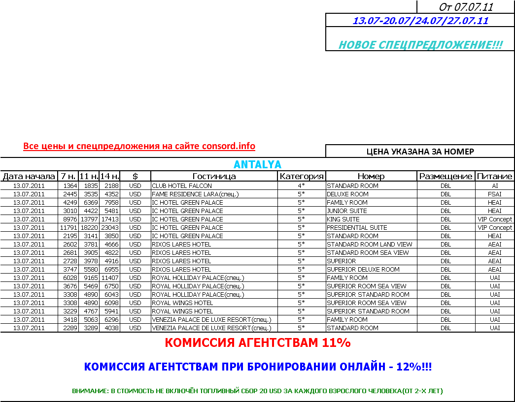 11 Июл 2011 17:03:35 ТУРЦИЯ АНТАЛИЯ с 13.07 на 7/ 11 / 14 ночей - САМЫЕ НИЗКИЕ ЦЕНЫ от фирмы КОНСОРД