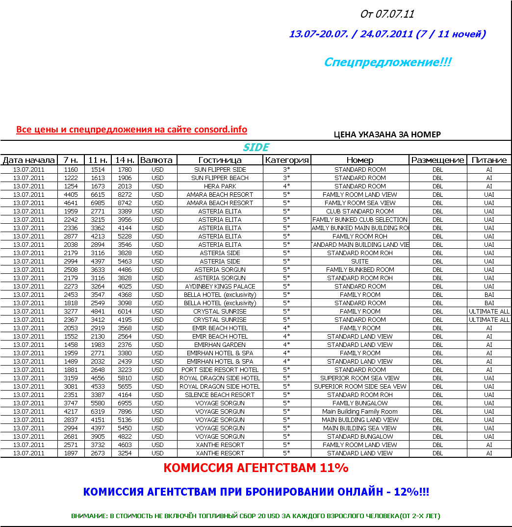 11 Июл 2011 17:00:32 ТУРЦИЯ СИДЕ с 13.07 на 7/ 11 / 14 ночей - САМЫЕ НИЗКИЕ ЦЕНЫ от фирмы КОНСОРД