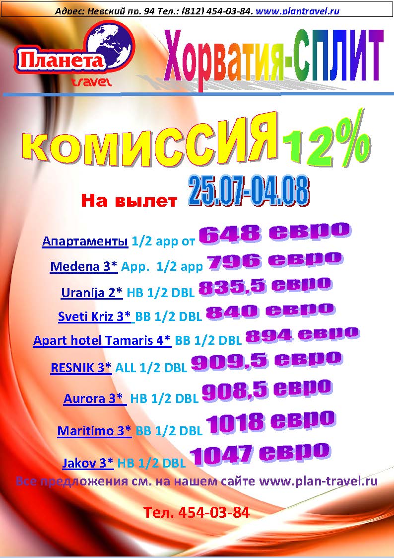 11 Июл 2011 13:07:29 ХОРВАТИЯ - Сплит, 25.07 от 648 евро! Комиссия 12% от фирмы ПЛАНЕТА TRAVEL