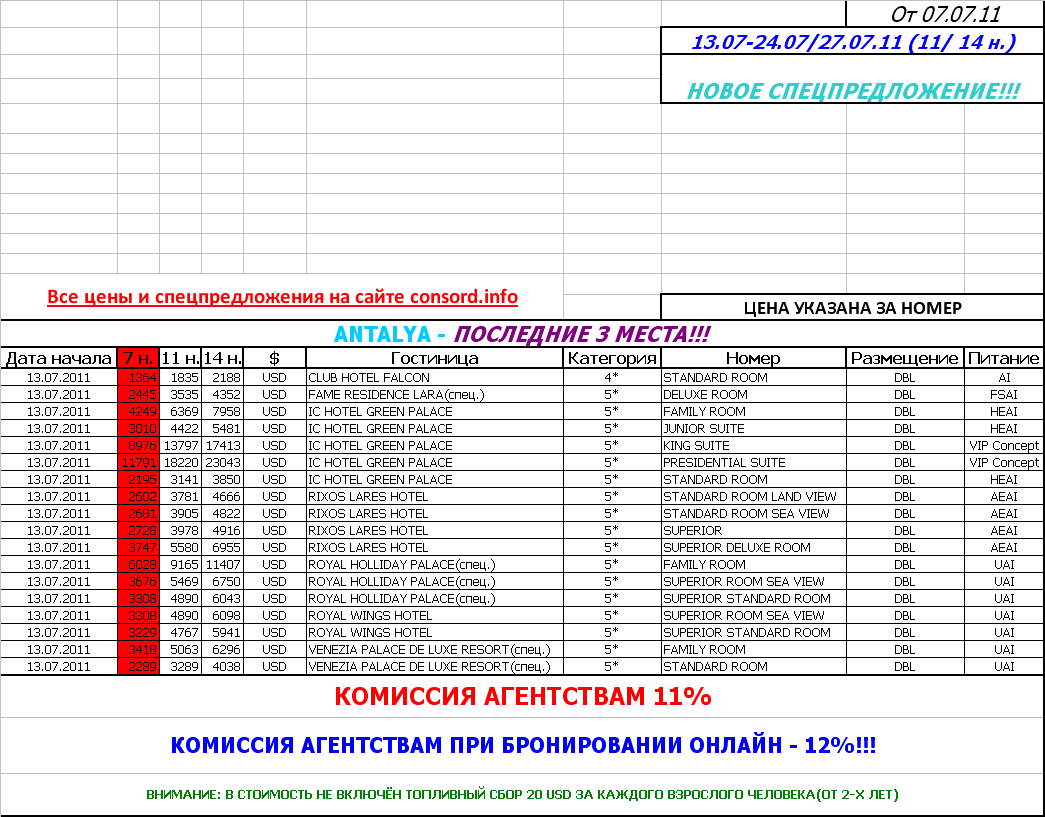 12 Июл 2011 10:43:22 ТУРЦИЯ АНТАЛИЯ с 13.07.11 на 7/ 11 / 14 ночей - САМЫЕ НИЗКИЕ ЦЕНЫ - 3 МЕСТА!!! от фирмы КОНСОРД