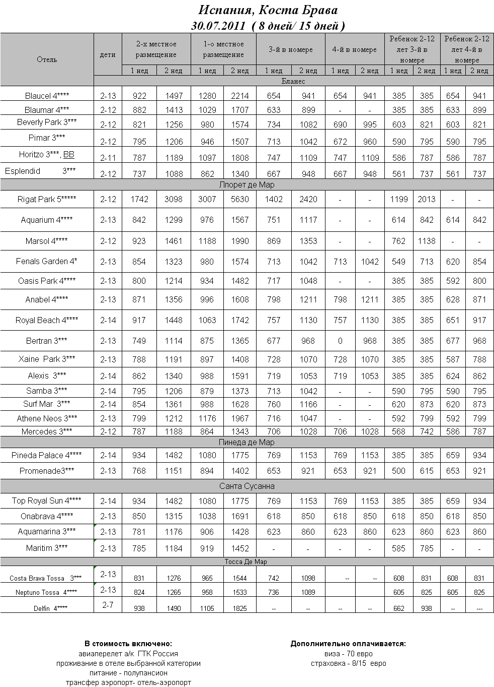 12 Июл 2011 20:00:15 ИСПАНИЯ - КОСТА БРАВА с 30.07 на 8/15 дней от фирмы ПРИМА