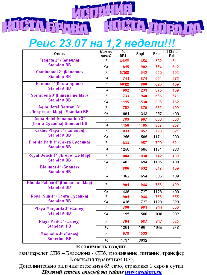 13 Июл 2011 18:01:06 ИСПАНИЯ 23.07 на 1/2 нед КОСТА БРАВА/ДОРАДА - НИЗКИЕ ЦЕНЫ от фирмы АВАТАРА