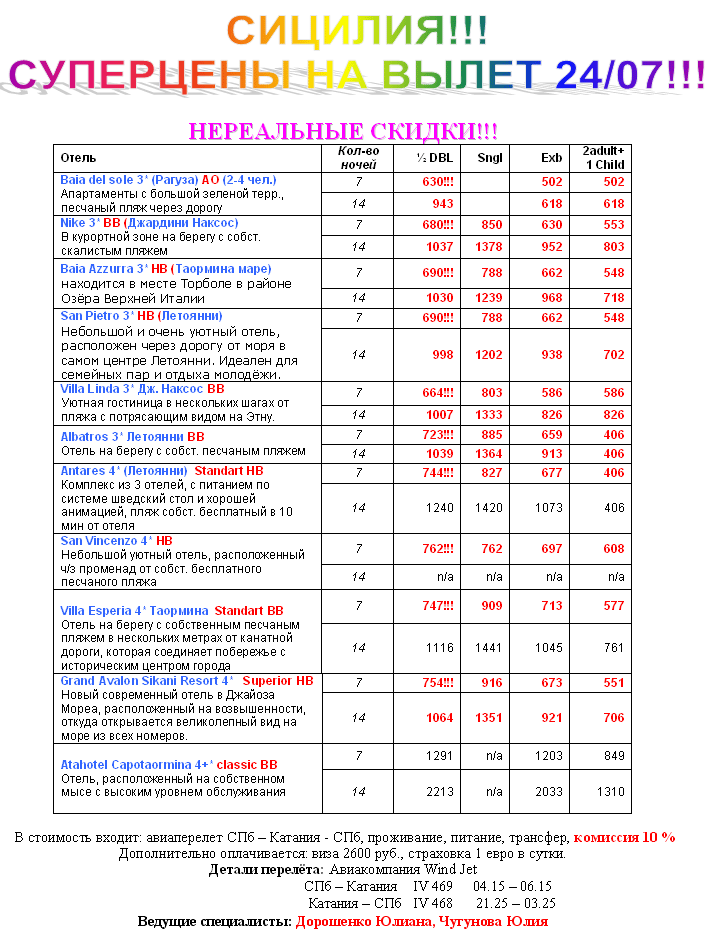 14 Июл 2011 14:07:51 ИТАЛИЯ - СИЦИЛИЯ 24.07 СУПЕРЦЕНЫ от фирмы АВАТАРА