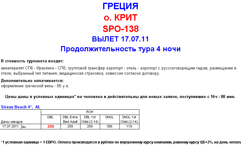ГРЕЦИЯ, о.КРИТ - ВЫЛЕТ 17.07 - SIRENS BEACH 4* ALL от 259 y.e. от фирмы ЮЖНЫЙ КРЕСТ |
