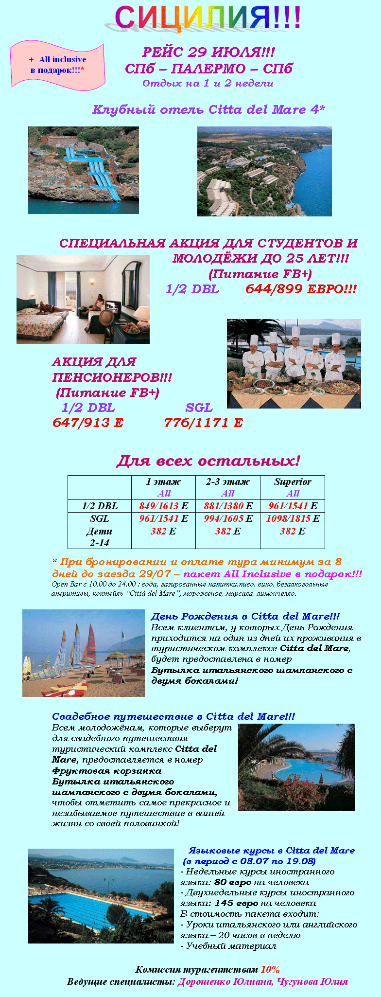 ИТАЛИЯ. СИЦИЛИЯ!!! СУПЕРСПЕЦПРЕДЛОЖЕНИЕ НА ВЫЛЕТ 29/07!!! Специальная акция для студентов и молодёжи!!! Языковые курсы в Citta del Mare. Комиссия 10% от фирмы АВАТАРА