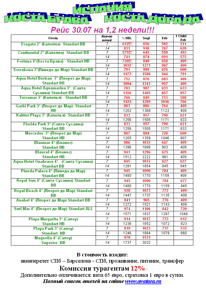22 Июл 2011 15:04:07 ИСПАНИЯ 30.07 на 1/2 нед, КОМ. 15% от фирмы АВАТАРА