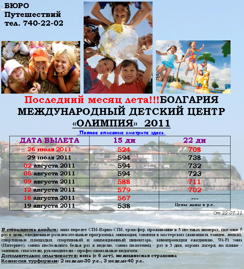 22 Июл 2011 14:05:39 БОЛГАРИЯ - Лагерь "ОЛИМПИЯ" СУПЕРЦЕНА на 26.07 от фирмы БЮРО ПУТЕШЕСТВИЙ