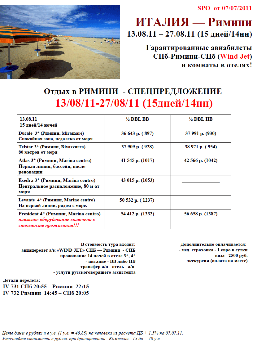 25 Июл 2011 11:13:20 ИТАЛИЯ. SPO Римини 13.08.11-27.08.11 от 897 у.е. от фирмы АРТ-ТРЕВЕЛ