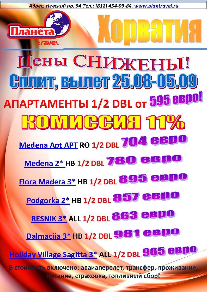 26 Июл 2011 11:33:43 ХОРВАТИЯ вылет 25.08 от 595 евро! КОМИССИЯ 11% от фирмы ПЛАНЕТА TRAVEL