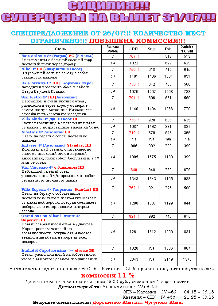 27 Июл 2011 12:14:24 ИТАЛИЯ - Сицилия с 31.07, Комиссия 10% Суперцены от фирмы АВАТАРА