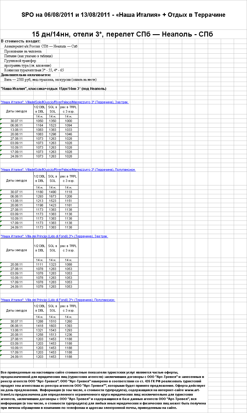 27 Июл 2011 11:22:54 ИТАЛИЯ. SPO на 06.08.11 и 13.08.11 "Наша Италия"+отдых в Террачине 15 дн/14нн, отели 3* от фирмы АРТ-ТРЕВЕЛ