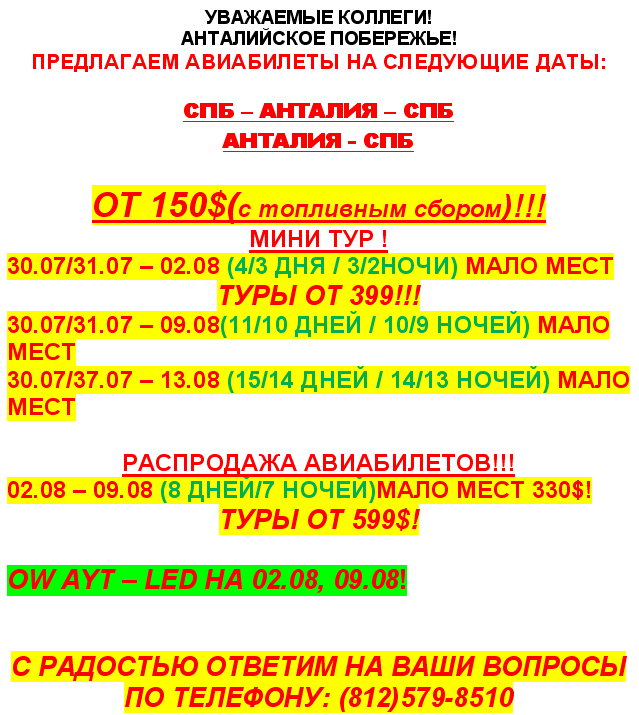 28 Июл 2011 14:30:16 ТУРЦИЯ - АНТАЛИЯ с 30.07/31.07/02.08 - АВИАБИЛЕТЫ и ТУРЫ от фирмы TRIVE ТУР